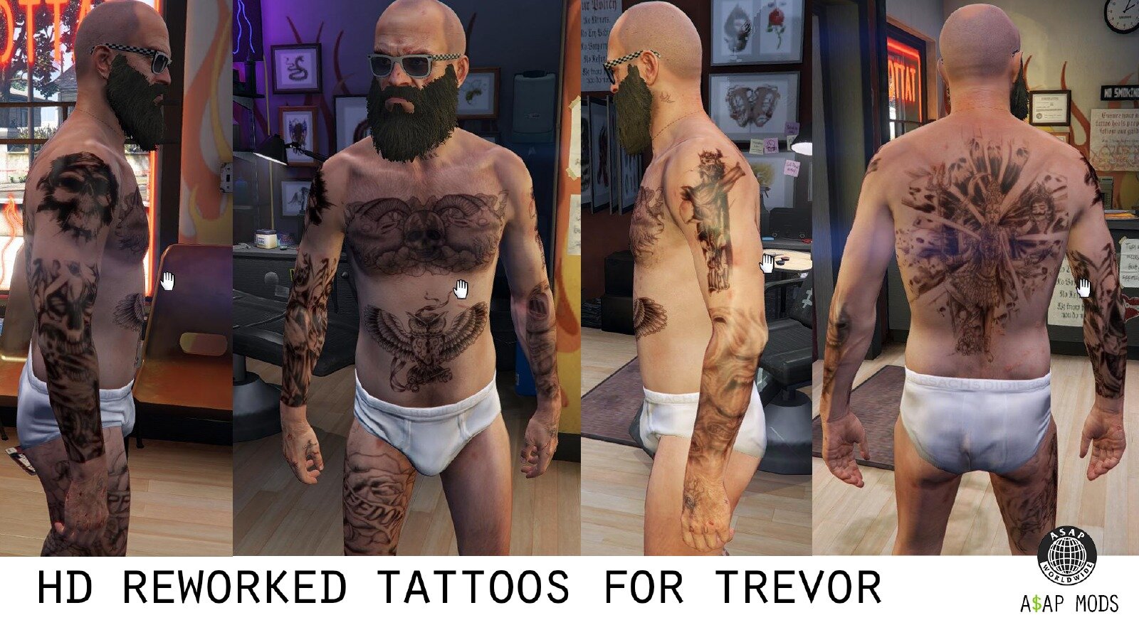 Ce pack contient de nouveaux tatouages pour chacun des 3 personnages de GTA 5.