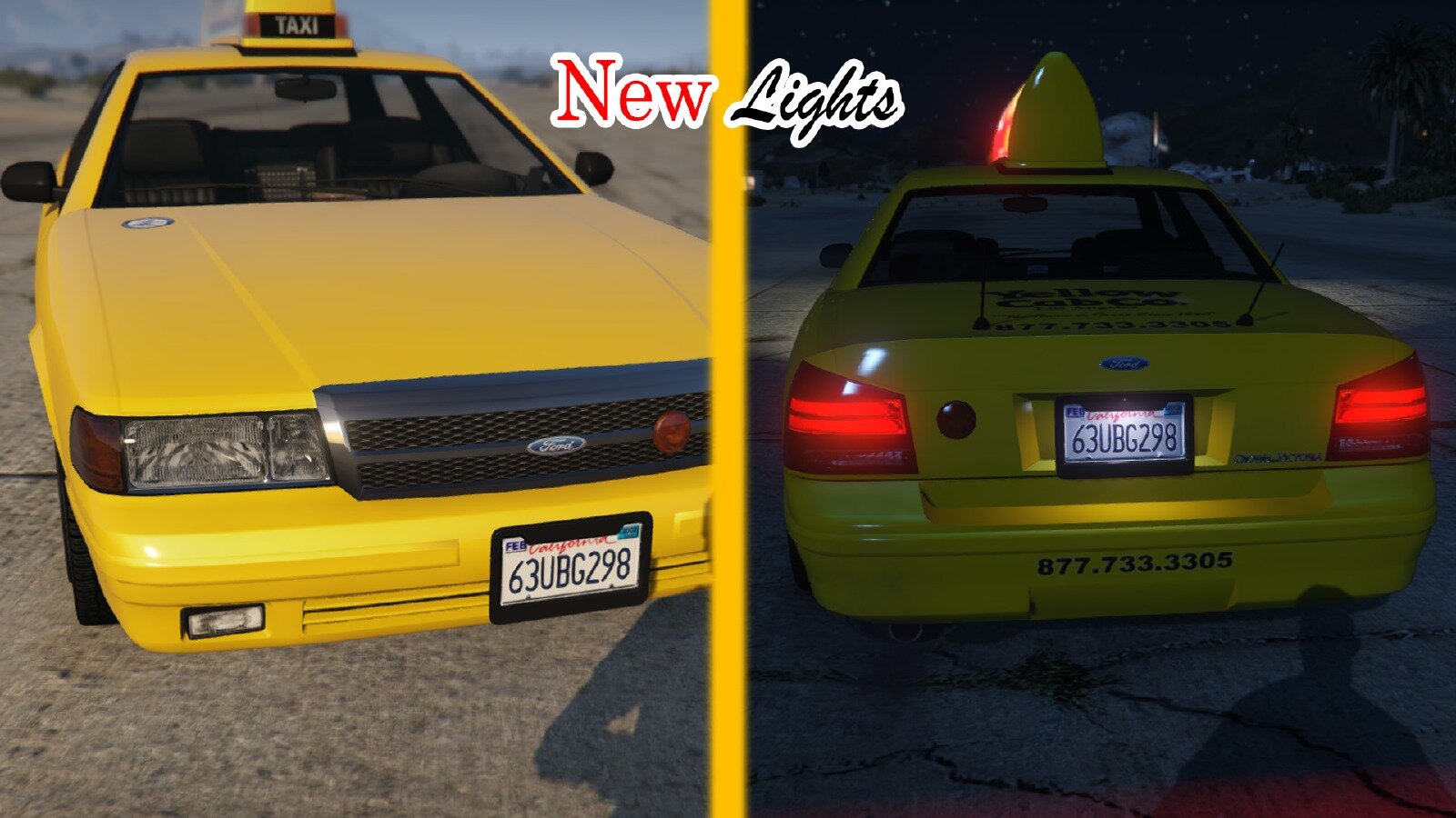 Ce mod remplace les textures des taxis de GTA 5 afin qu'ils soient intégralement jaunes et qu'ils ressemblent aux "Yellow Cabs" Ford Crown Victoria.